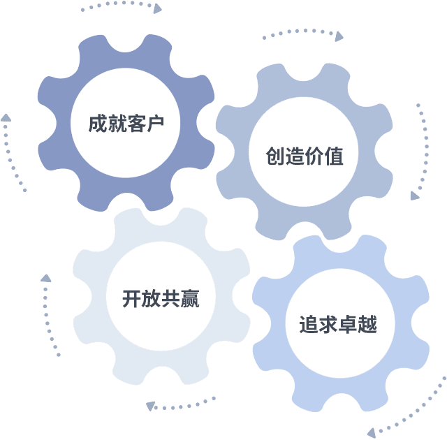 成就客户是一切决策的出发点,,,创造价值是衡量所有工作的标准,,,追求卓越是我们做事做人的态度,,,,开放共赢是我们的格局也是最终的结果。。价值观的齿轮环环相扣,,,,推动着组织里的每个人不断向前。。。。